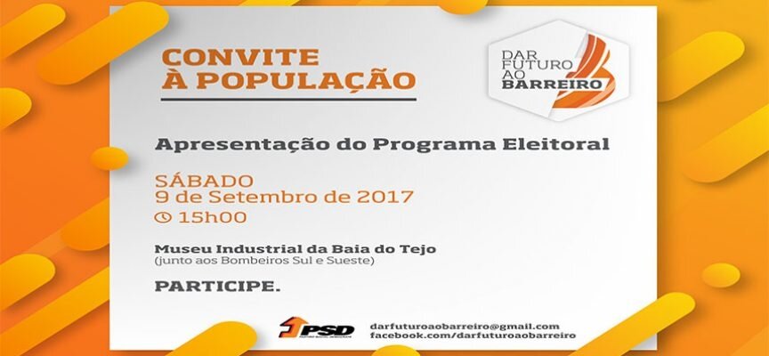 Os candidatos do PSD aos órgãos autárquicos do Barreiro, vão apresentar o programa eleitoral para o concelho no próximo dia 09 de setembro, sábado, às 15 horas.